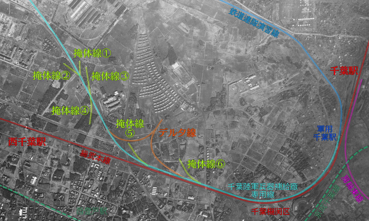 上掲の写真に各線名と「デルタ線」、防空壕線としていた引込線群は「掩体線」として記載。