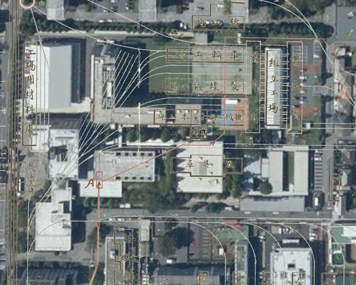 この空中写真に前回同様、「材料廠一般図」を重ねたものが下図です。